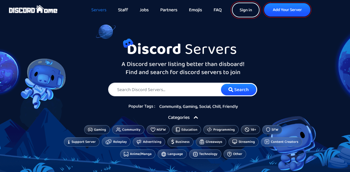 DiscordHome (DH) is a dedicated Disboard listing website that serves as the central hub for Discord server enthusiasts. Whether you're a server owner looking to promote your community, someone interested in finding new servers to join, or even if you're searching for staff or partners for your Discord server, DH has got you covered.