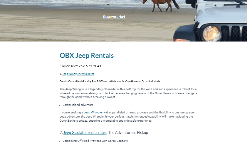 Ready to start your Outer Banks adventure? Booking with OBX Jeep Rentals is easy. Simply give us a call at 252-573-5041 or send an email to Bret@Beach4x4.com to reserve your Jeep today. Whether you're a seasoned off-road enthusiast or a first-time visitor to the Outer Banks, we invite you to experience the thrill of exploring this breathtaking destination in style with Beach Jeep Rentals OBX.