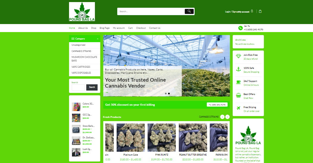 Pound Bag LA is your ultimate destination for premium CANNABIS STRAINS, concentrates, and edibles. With a commitment to quality and customer service, we offer an unparalleled experience for all your cannabis needs. Explore our wide range of products, including disposable vape carts, vape cartridges, and mushroom chocolate bars, and discover why Pound Bag LA is more than just an online dispensary—it's an institution.